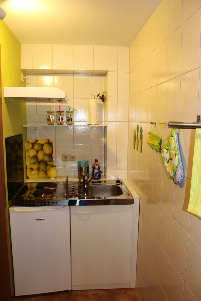 - kleine Küche mit Herd,Kühlschrank und elektrischen Geräten (Mikrowelle,Kaffeemaschine,Toaster,Wasserkocher)