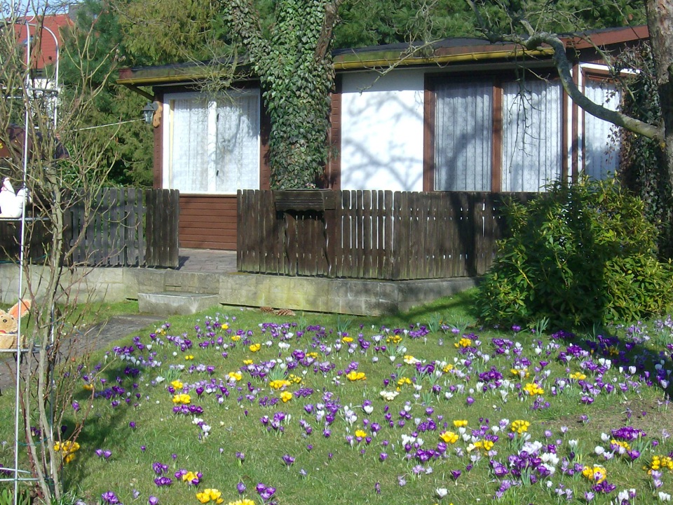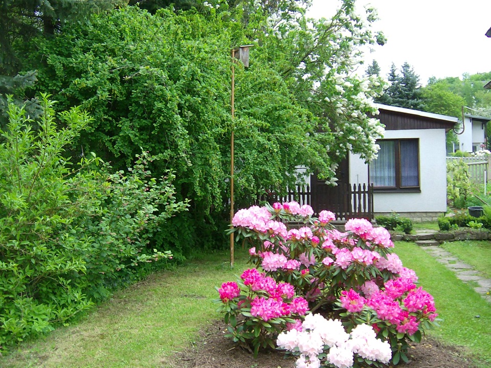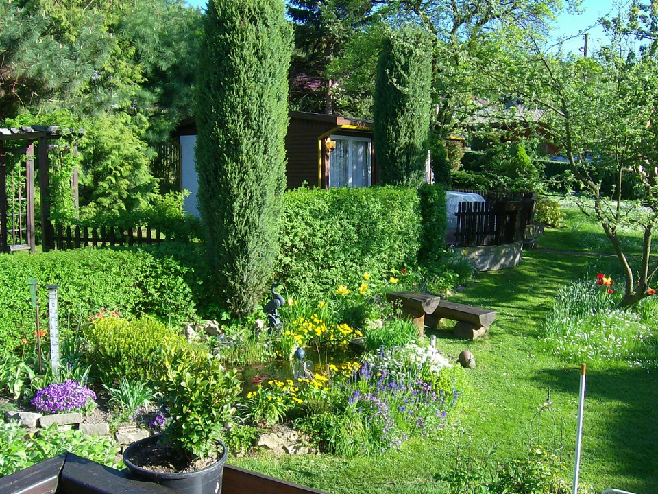 Zwei Ferienhäuser in einem gepflegten, ruhigen Gartengrundstück mit Terrasse, Gartenmöbeln und Liegewiese.