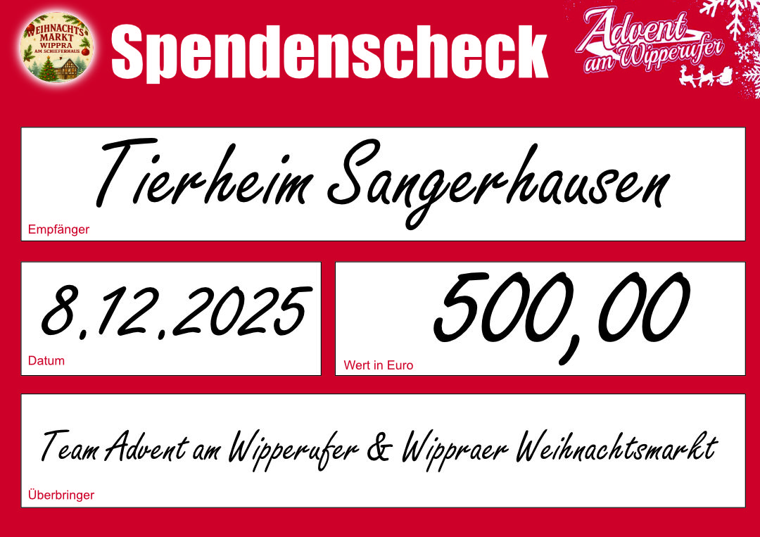 Im Rahmen unserer alljährlich stattfindenden Veranstaltungen "Advent am Wipperufer" und "Wippraer Weihnachtsmarkt" konnten wir die stattliche Spendensumme von 500,00€ für das Tierheim Sangerhausen erzielen. Wir sind überwältigt von der Spendenbereitschaft und möchten uns recht herzlich bei allen Unterstützern bedanken. Wir wünschen allen eine frohe und besinnliche Weihnachtszeit und freuen uns Sie auch im kommenden Jahr wieder in Wippra begrüßen zu dürfen.